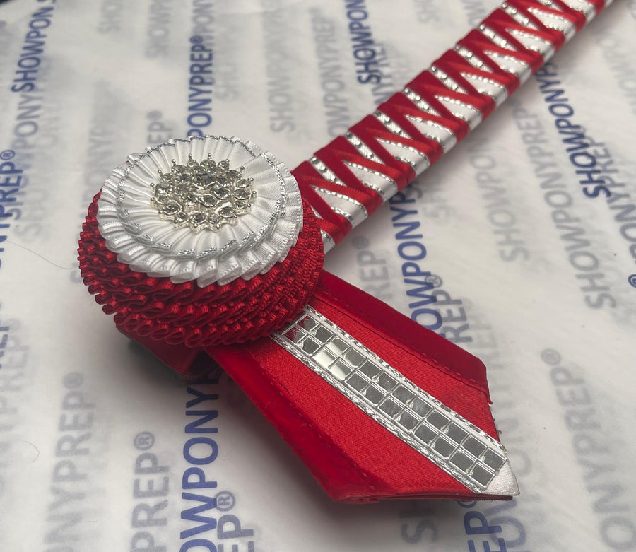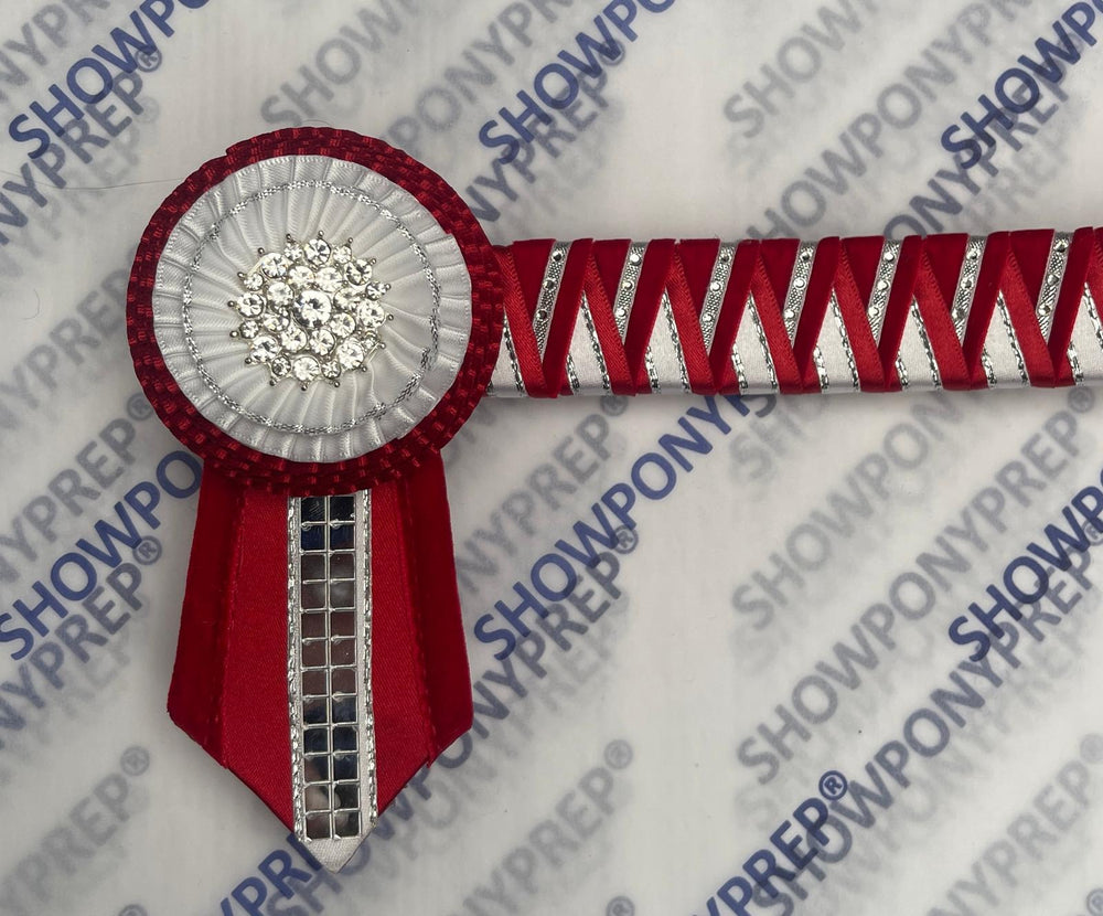 The browband is 1” deep and is an AUS design with intricate wrap of ribbon and individually placed crystals.